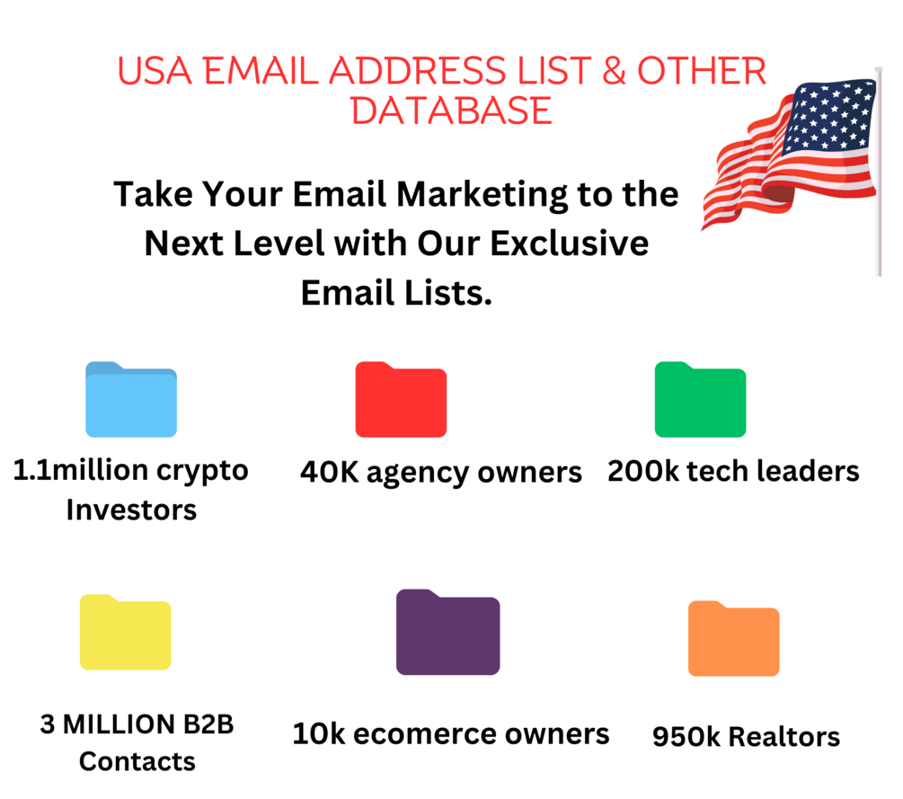Unlock the power of targeted marketing with our premium email contact list! Gain access to over 1.1 million crypto investors, 3 million B2B contacts, 10k ecommerce owners, 40k agency owners, 200k tech leaders, and 950k realtors - all for just $8!